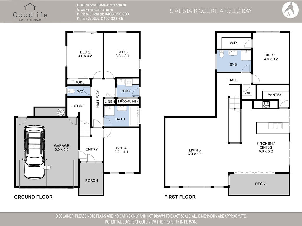 Light-filled interiors feature timber floors and calming coastal tones. The upper level includes a spacious open-plan living and dining area, a modern kitchen with walk-in pantry, and a generous alfresco deck perfect for entertaining. The private master suite has a walk-in robe and ensuite, while three additional bedrooms, a family bathroom, powder room, and laundry with garden access complete the lower level.